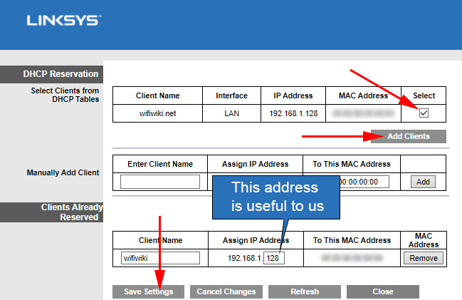 Another window will open, in which you need to check the box next to our computer and click on “Add Clients”. Our computer will appear at the bottom, in the “Clients already reserved” section. We will need the IP-address, which is specified in the table in the “Assign IP-address” field. Memorize it. This is a static address that the router will always give for this computer.