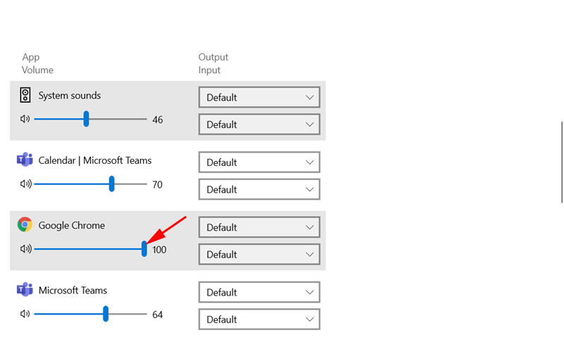 Carefully check the volume level and sound output device for the desired browser. Try setting the output device to “Default”. Or try different options from the list of available devices.